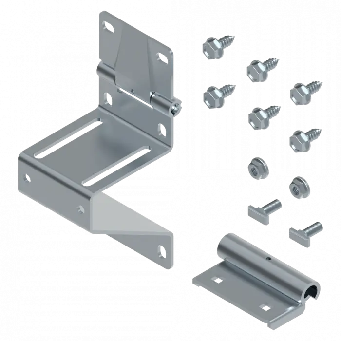 De complete set ConDoor ST9V zijscharnieren verbindt de afzonderlijke deurpanelen stevig met elkaar. Het scharnier wordt aan de zijrand van het paneel bevestigd en zorgt voor een nauwkeurige geleiding van de rol. Dankzij de meegeleverde schroeven en moeren is directe montage mogelijk – er zijn geen extra onderdelen nodig.